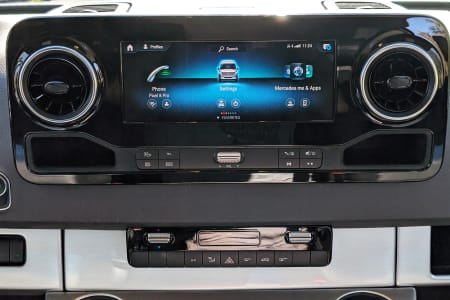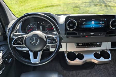 Driving the Thor Sanctuary is easy and comfortable. The cabin is modern and very well equipped. It has a large digital touch display and can easily sync to your phone for hands-free navigation, music and Apple CarPlay. The van sits high, has great visibility and the backup camera makes it easy to park it anywhere. Did we mention that the seats are heated and also swivel around to the back when you're not driving it?