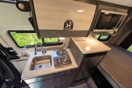 Inside, you'll find a thoughtfully designed living space packed with many modern amenities including gas burning stovetop, microwave, fridge, TV, Bluetooth speaker, and an iPad that wirelessly controls the entire RV. Also, this van has solar charging to keep your adventures going off-grid.