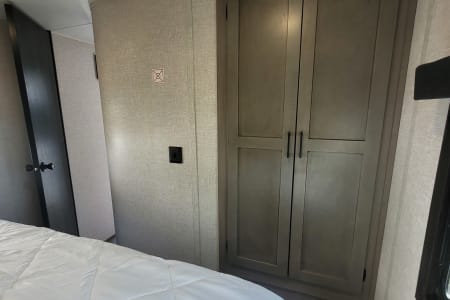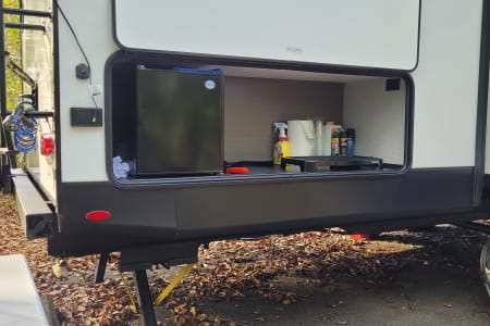 This travel trailer will have you feeling right at home! The rear private bunkhouse has plenty of space for the kiddos to move around, as well as a set of full size bunk beds with ladder, two wardrobes, and a slide with a flip-up bunk above a jackknife sofa. Everyone can gather together and either relax on the theater seating across from the entertainment center with a fireplace or play a game at the table and chairs. The kitchen island makes meal prepping easier and you can store your dishes in the hutch. You could even cook your meals while breathing in some fresh air with the outside kitchen which also has a refrigerator to keep your beverages cold. There's a full bathroom to stay clean and a closet in the front private bedroom !