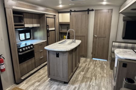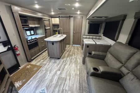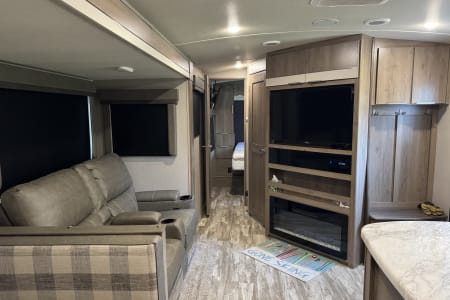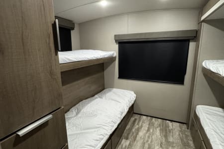 This travel trailer comfortably sleeps up to 8 people, featuring a private master bedroom, a spacious bunkhouse, and a convertible sofa and dinette. It's designed to provide a cozy and relaxing space for everyone. The fully equipped kitchen includes a refrigerator, microwave, stovetop, and oven, allowing you to prepare your favorite meals while on the road. After a day of adventure, you can unwind with flat-screen TVs (bedroom & living room) and Bluetooth stereo system inside, or enjoy the evening outside under the electric awning with LED lighting.