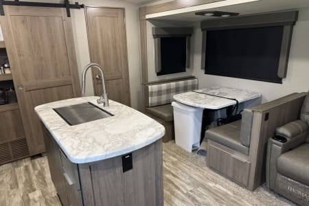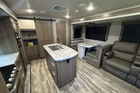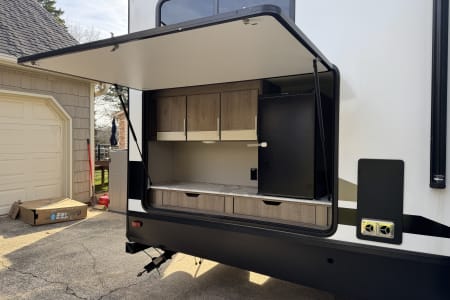 For those who love cooking outdoors, the trailer comes with a convenient outdoor kitchen, complete with a mini-fridge, cooktop, and sink. The spacious bathroom offers a large shower, vanity, and plenty of storage space for all your essentials. No matter the season, you'll stay comfortable with the powerful HVAC system that keeps the trailer cool in the summer and warm in the winter.