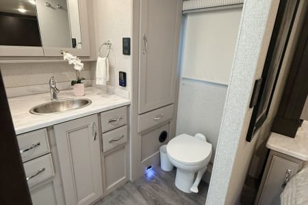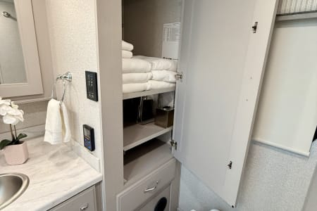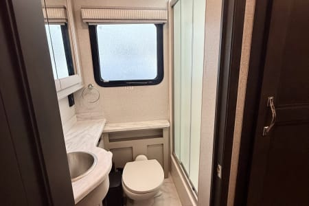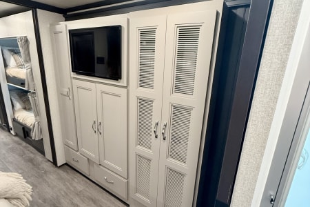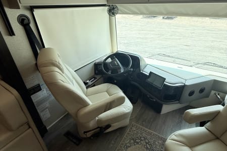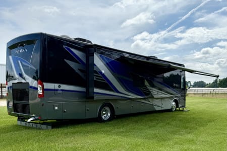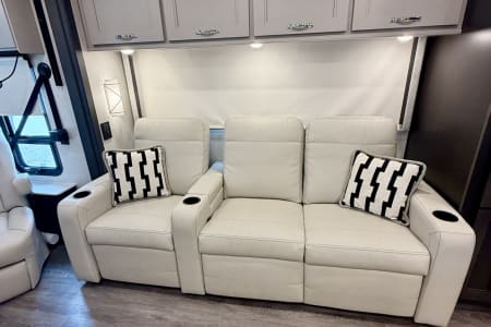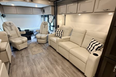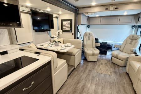 This luxurious coach can fit your whole crew thanks to the added bunk beds within the full-wall slide! There is also a drop-down overhead bunk, a Tilt-A-View inclining queen bed and a 72" Dream Dinette for even more sleeping space! A full rear bath on board will let you clean up each morning, and there is a second full bath across from the bunks for your guests; how convenient! Head to the kitchen to prepare breakfast on the two burner electric induction cooktop or in the stainless steel over-the-range convection microwave, and there is a 19 cu. ft. side-by-side residential refrigerator where the milk and eggs can go back in. After a day outdoors relaxing under the 20' power awning and watching the game on the exterior 40" LED TV, you can head indoors to play a game at the Dream Dinette or get cozy with a book on one of the three fully reclining comfy seats.