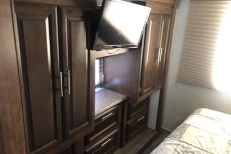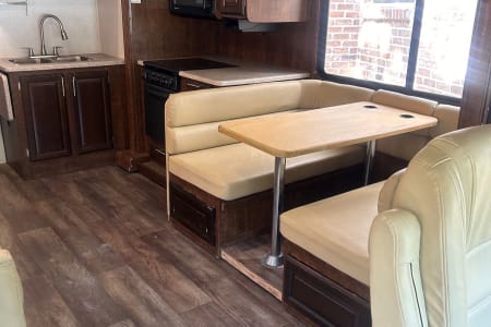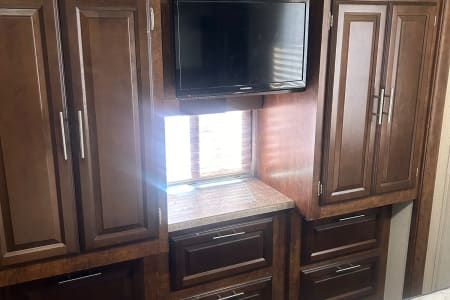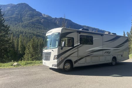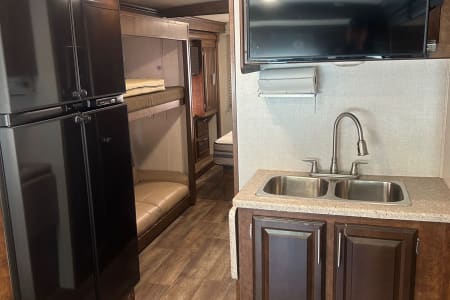 Our unit is built to make family memories. Class A units provide a spectacular view for all the occupants traveling down the road. Comfortable leather seating with space to spread out while traveling. TVs in the living area and bunk area to keep kids entertained while buckled in and traveling. This unit also has an extra large fridge to keep everyone fed and hydrated. When you reach your destination, open the two slides to fully take advantage of this spacious unit. It comes with an outdoor TV and speakers to watch your favorite show or listen to your favorite music while playing a game or eating dinner outside.