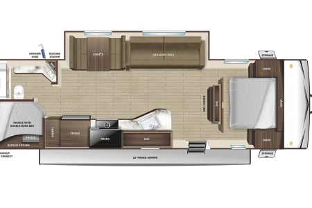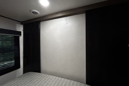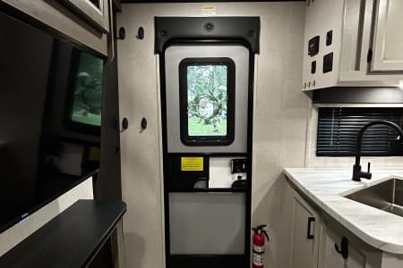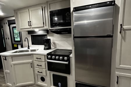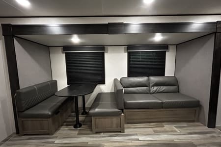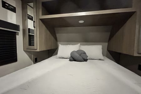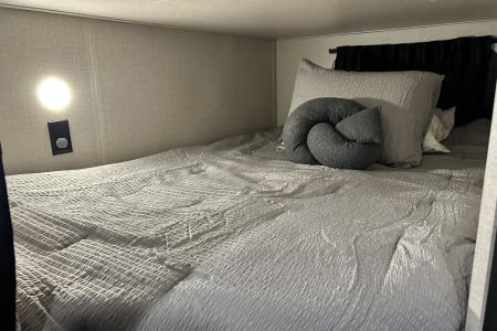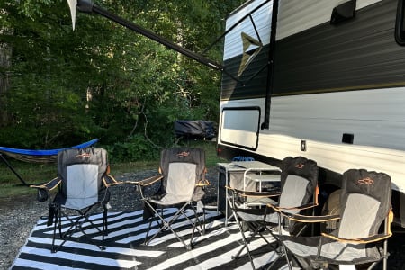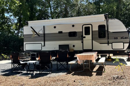 Enjoy the perfect family getaway in this spacious and modern 26-ft travel trailer with a slideout! Sleeps up to 6 comfortably with a private queen bed suite, double-over-double bunk beds, a jack-knife sofa, and a convertible dinette. Plenty of space to relax indoors after a day of outdoor activities. The camper features a private primary suite with sliding doors for added privacy, a separate family bunkhouse area, and a large central entertainment/living space. The fully equipped kitchen includes a fridge, microwave, stove, and sink. There's also an exterior mini fridge to keep your drinks cool and within reach.. Full bathroom with shower. Stay cool with A/C and enjoy meals under the 16' power awning while listening to music. Camper delivery is the only option, making your getaway as easy and stress-free as possible—just arrive at your site and everything will be set up and ready to enjoy. Ideal for families or couples seeking adventure with all the comforts of home!