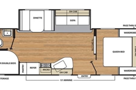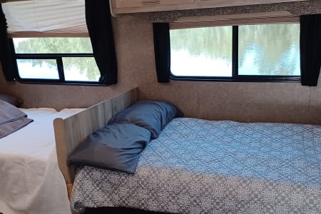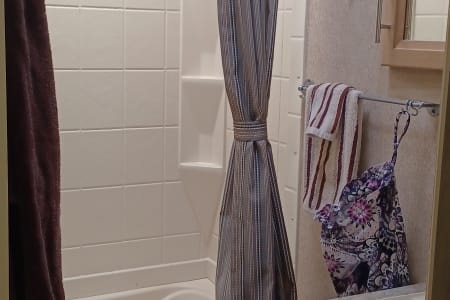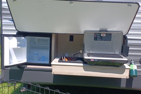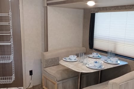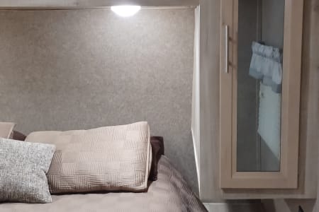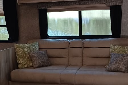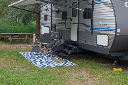 Welcome to Cain's Home away from Home. Our Camper includes a private master with queen bed, closets on either side. Storage Under bed and above. Living space includes TV, lots of DVD's for your viewing pleasure, inside and outside radio speakers. Kitchen area includes sink, refrigerator, stove oven and an outdoor kitchen as well. All Bedding, towels, toilet paper, dishes, pots, pans and paper towels are included. Included are 1 gravity chair, one other chair two side tables, and 4' table. Pets are welcome we offer a pull out for dog dishes and dog food located by dinette. We've also included a round metal pen for your animals.