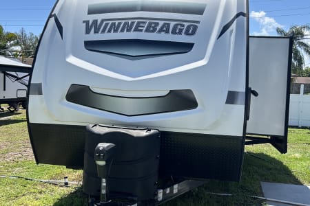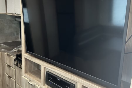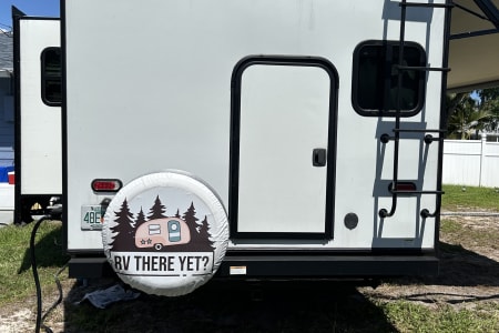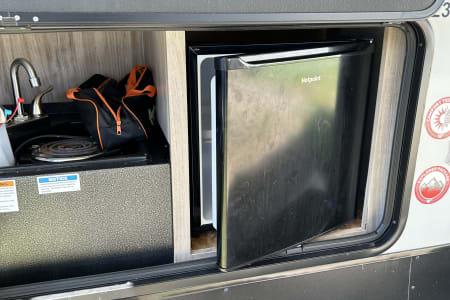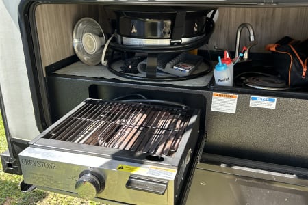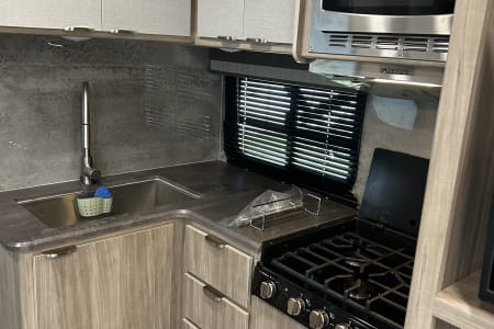 pillows and rugs, kitchen utensils including pots and pans, paper towels, tin foil, garbage bags, a microwave, range stove, refrigerator with freezer, and a coffee maker. Also included are 2 smart tvs. two camping chairs with a small table and large outdoor rug that can be utilized under the outside 18’ awning along with an outside kitchen including a refrigerator gas grill and sink.