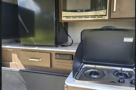 *Inside, you'll find a dining table, a fully functional kitchen sink, a microwave, an oven, a range stove, and a refrigerator. It also includes an inside shower, toilet, and hot and cold water supply for your convenience.