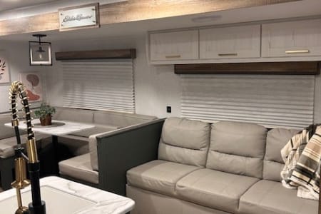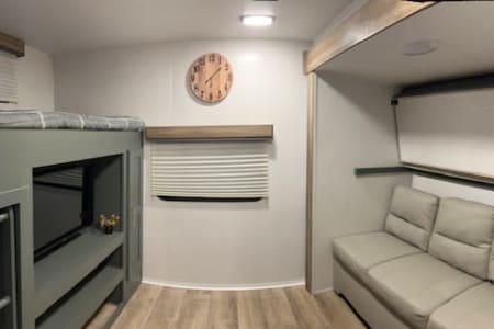 This trailer has a comfortable queen sized bed in the private front bedroom, theater seating in the main area that converts to a bed. The u-shaped dinette also converts for more sleeping areas. In the private bunkroom, there are 2 twin bunks and a sofa that converts into a bed.