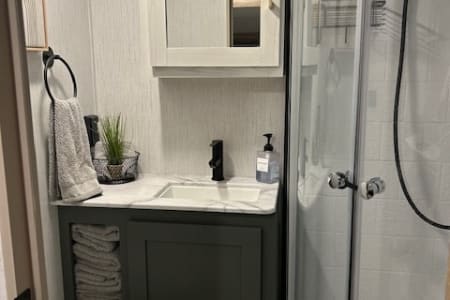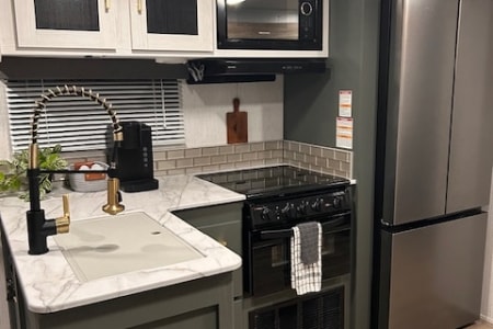 Outside you can enjoy the outside speakers to listen to your favorite music while enjoying a wonderful campfire. There is also an outdoor kitchen that includes a mini fridge and griddle.