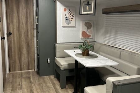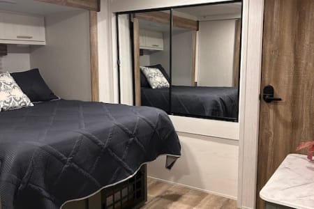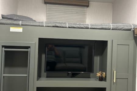 This trailer has 2 AC units that will keep you cool from the summer heat. It also has a fireplace for those cool mornings and propane furnace for cold nights.
