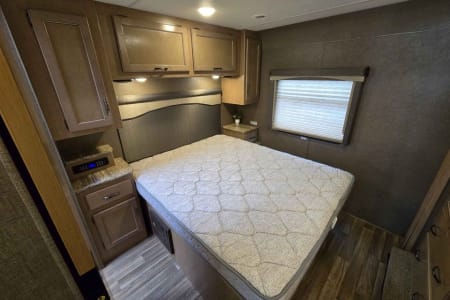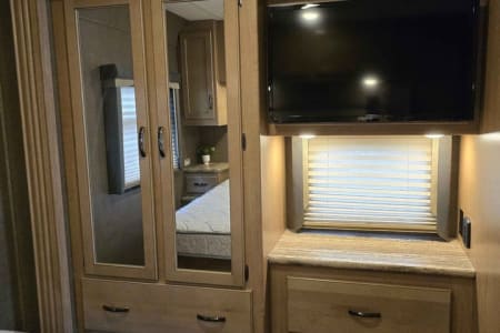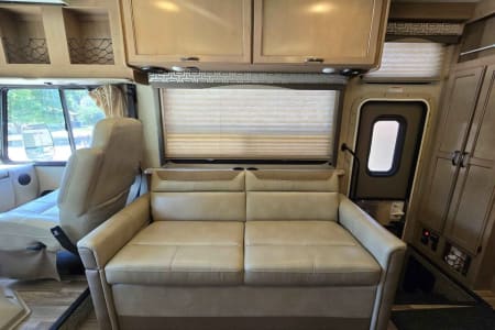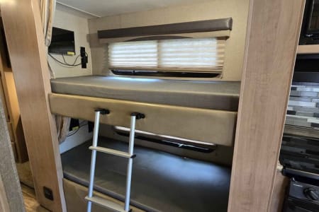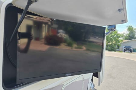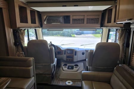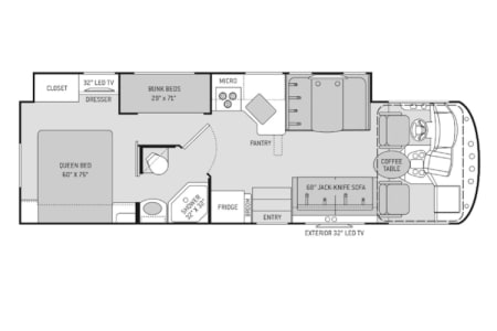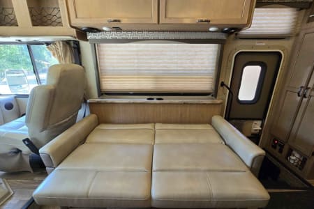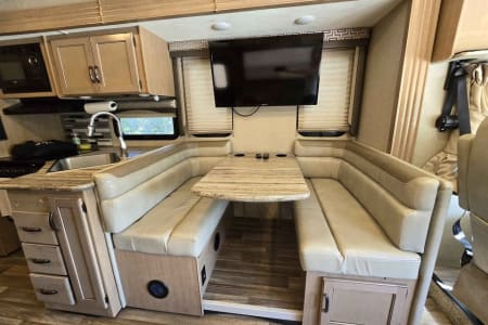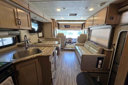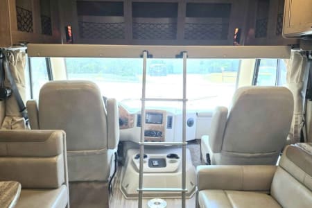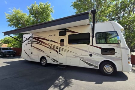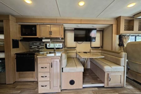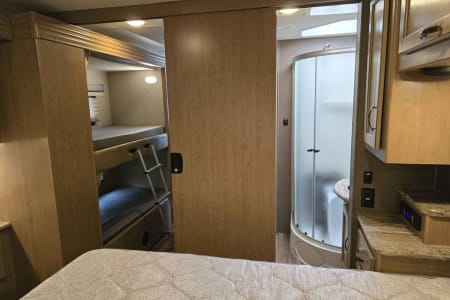 This Class A motorhome boasts a range of features for your comfort and convenience. Spanning 31 feet in length, it includes bunk beds, a master bedroom with a dedicated door, and a convertible table for additional sleeping space. Above the driver's cabin, you'll find a loft, and the sofa easily transforms into a bed. With four TVs, an outdoor TV . A indoor and shower, This motorhome offers ample storage space, making it a perfect choice for your travel adventures. air-conditioners insure a nice temperature throughout the cabin.
