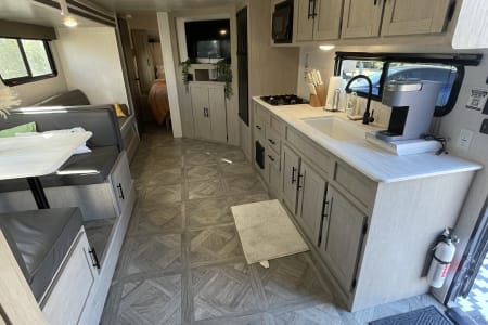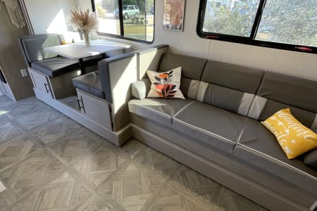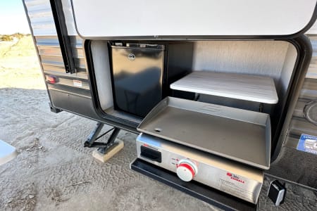 The large slide-out in the main living area creates a spacious and inviting environment, housing a comfortable sofa and a booth dinette where you can enjoy meals and unwind. The fully equipped indoor kitchen includes a three-burner cooktop, microwave oven, and ample counter space to prepare meals with ease. If you prefer to cook outdoors, the exterior camp kitchen offers a refrigerator and griddle, making outdoor dining a breeze.