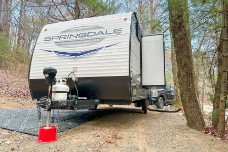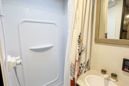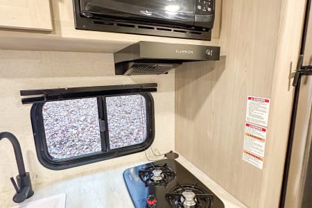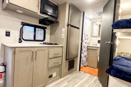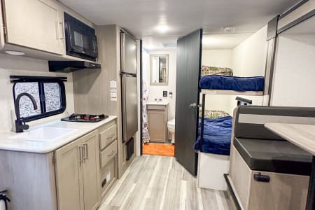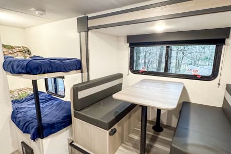 This new 2024 travel trailer is a great camper for any occasion: First time campers, seasoned campers, festivals, tailgating, or extra space for guests at your property! It is the perfect balance of being outdoors and having the indoor comfort to stream a movie, relax, or set up for work. It is lightweight and can be towed by almost any SUV or higher. The only requirement is for the towing vehicle to have a brake controller. Delivery and set up is also available. Comfortably sleeps 5-6. Inside you will find a queen size bed, a dinette that converts to a double bed, and there are two twin bunk beds in the rear of the camper. Linens are provided at no extra cost. The kitchen features a refrigerator, microwave, range, and sink. Pots, pans and utensils are provided. The bathroom features a stand up shower, toilet, vanity and sink. Our travel trailer can be used at full hookup or water/electric sites. Most pets allowed. No smoking allowed in or near the camper.