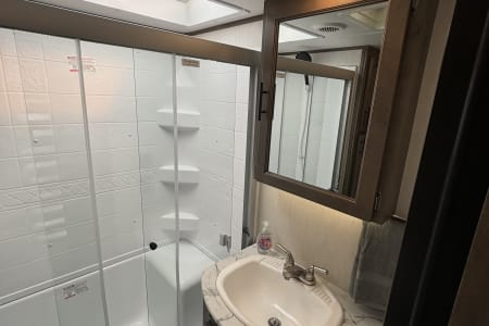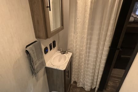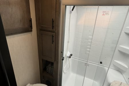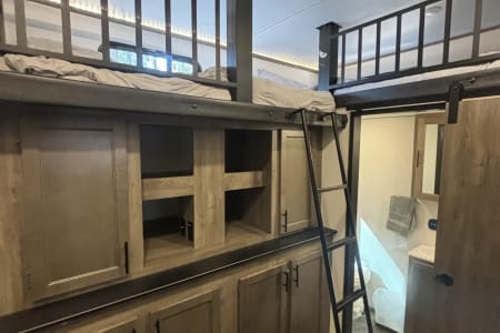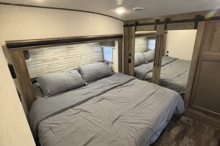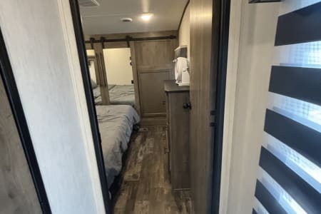 This the perfect camper for a big family or a group of friends. It has its own separate bunk room in the back with its own separate bathroom. With four slides this camper has all the room you need. It also has a separate door to the bathroom from outside for easy access. It comes fully furnished with everything needed to go camping. Bedding, towels, utensils, cooking utensils, bowls, plates and cups, a coffee pot also. .