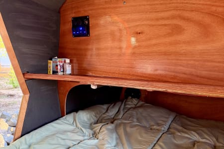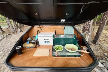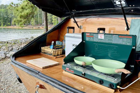 You’ll have everything you need whenever you pull over to explore the great outdoors, cook a meal or get some rest. Inside, you’ll find a queen-sized mattress, complete with plenty of pillows and blankets that make up your own cozy den. Out back, the galley kitchen features a spacious countertop with a stovetop, cooler, pump sink and all the kitchenware you’ll need to prepare a real meal with a different view every time.