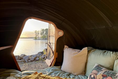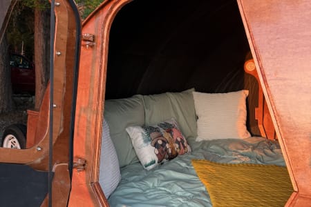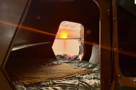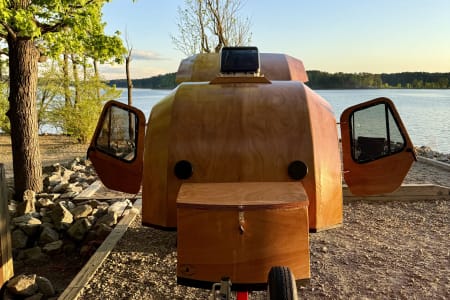 The beautiful wood and fiberglass design turns heads and sparks conversation wherever it goes. Make lasting memories, rent our teardrop camper today!