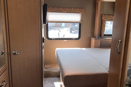 Above the cab, there is a bunk which features 54"x96" of sleeping space, overhead cabinets, and a 40" LED TV with a swivel arm.