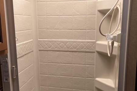 The bathroom is in the rear left corner of this model. Here you will find a sink, medicine cabinet, toilet, and a 24" x 36" shower, plus so much more!