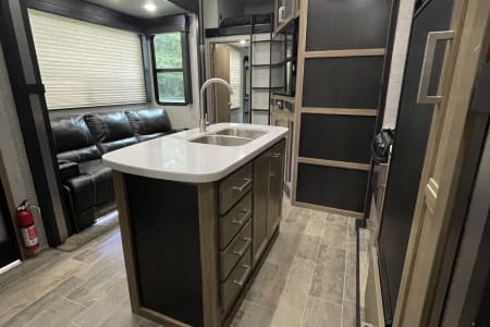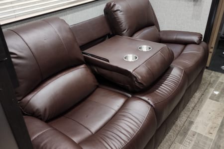 As you step inside, you will find an open kitchen/living area equipped with an RV-sized fridge/freezer, gas range, vent hood, microwave, and an island with a sink. Across from the kitchen is your 3-seat reclining/massaging couch and a flat-screen TV. Also in the living/kitchen area is a loft bed.