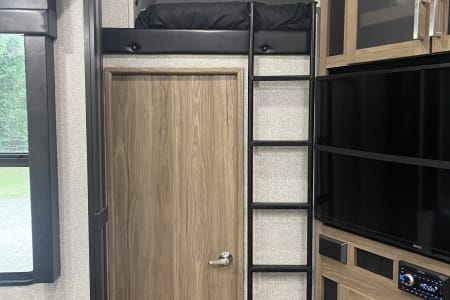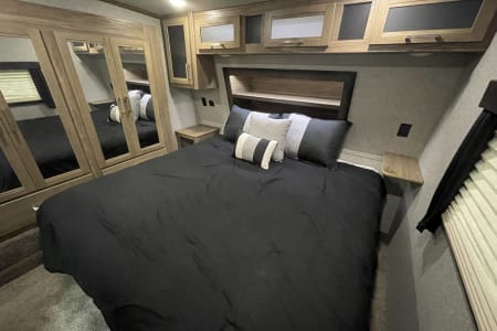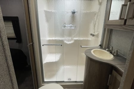 Moving up the stairs to the right of the kitchen is the master bedroom and bath. The bedroom has a queen bed and plenty of storage for your adventure gear. The full bath features a shower, toilet, and sink with storage above.
