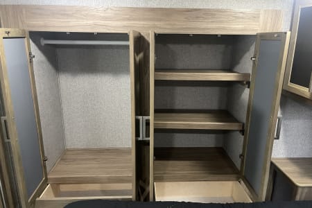 The RV has all the standard amenities you would expect to find including 50A electric service, water hookup, and sewer hookup. If your adventure is more remote, the unit is equipped with an onboard generator, fresh water holding tank, and waste holding tanks.