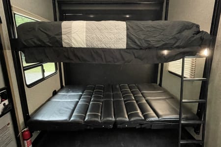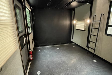 Back through the living area, you will find the "garage". This is a very versatile space as it has in-floor tie-downs for your toys (motorcycles, dirt bikes, four-wheelers, side by side, golf cart, bikes, scooters, and more). When you get to your destination and unload your toys, the garage can convert to a second bedroom or lounge area. The bottom-tracked "bunk" can be lowered to make two couches with a table between for dining or late-night card games (many a game of spades or uno has been played at this table). When it's time for bed, the upper "bunk" can be lowered for a sleeping total of 4 in the garage. It also has its own half bath and exterior door for added convenience.