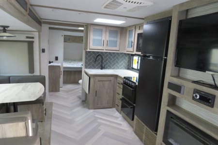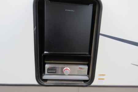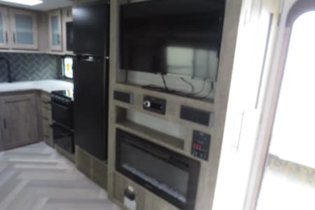 Outside, you'll love the full-length power awning with LED lights and outdoor kitchen, perfect for enjoying meals or relaxing at your campsite. Other amenities include a 40" LED TV, Bluetooth stereo system, and an electric fireplace for added comfort.