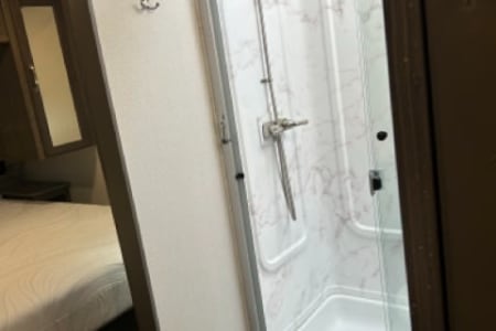 Bathroom: A well-designed bathroom includes a shower with a glass door, toilet, sink, and linen storage, making it easy to freshen up after a day of adventure.