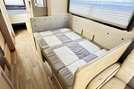 Sleeps 6: queen size bed in the bedroom, queen size bunk, and dinette converts to sleep 2 but we recommend using it for 2 small kids or one short adult.