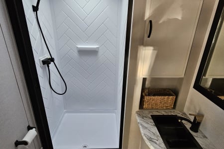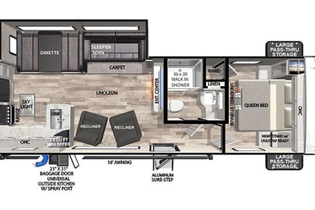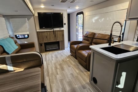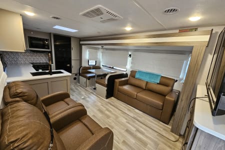 Wonderful living area with recliners, couch and dinette in open kitchen and TV, with master bed and bath. Perfect for a couple or entertaining guests.