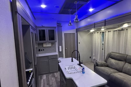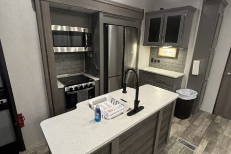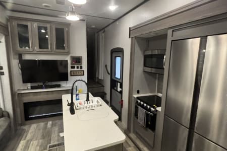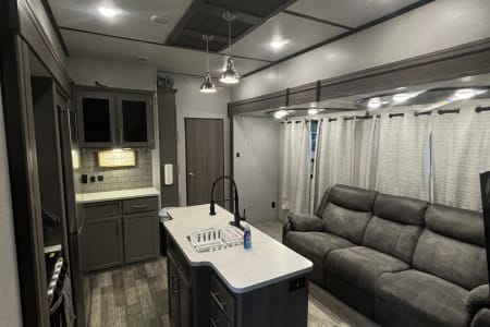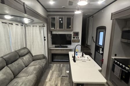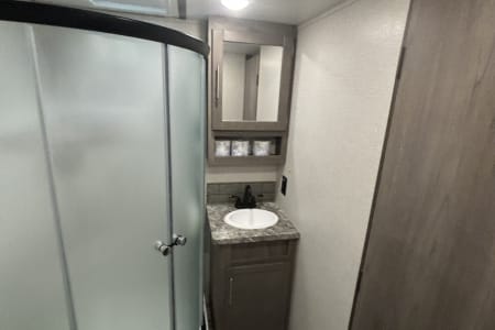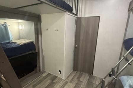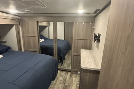 This the perfect camper for a big family or a group of friends. It has its own separate bunk room in the back with its own separate bathroom. With four slides this camper has all the room you need. It also has a separate door to the bathroom from outside for easy access. It comes fully furnished with everything needed to go camping. Bedding, towels, utensils, cooking utensils, bowls, plates and cups, a coffee pot also. .