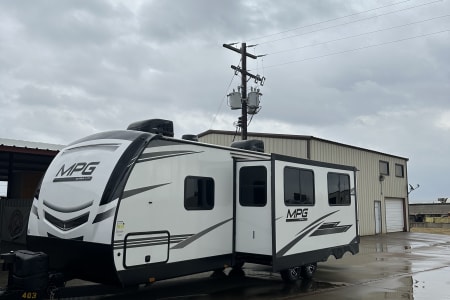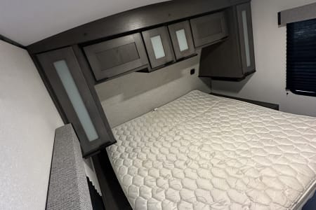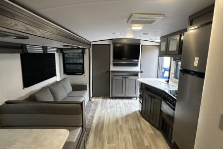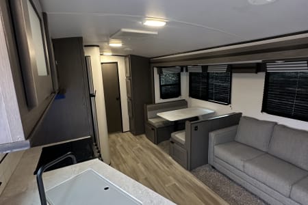 Everyone is going to love this Travel Trailer with a private bunkhouse! There are triple bunks, plus a dinette under one bunk for the kids or your friends to enjoy their own privacy, sleeping space and sitting area. You'll enjoy having your own front private bedroom, and there is a booth dinette and sofa within the large slide out for more seating and sleeping space. Meals can be prepared on the three burner cooktop indoors, or outdoors on the outside griddle.