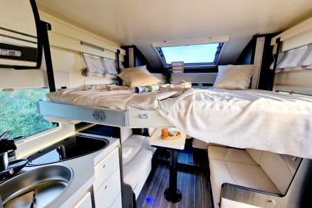 Côté couchages, aucune transformation nécessaire pour vous pelotonner dans son grand lit double central, ou vous hisser dans le lit de pavillon double.