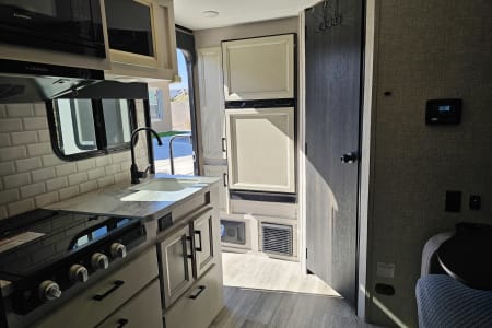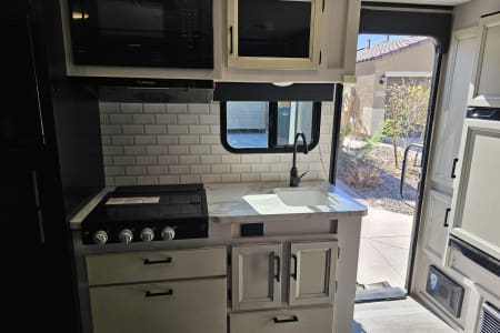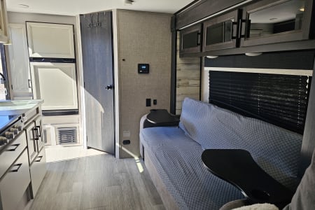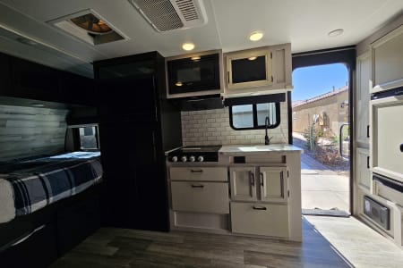 Efficient Kitchen: Fully equipped kitchenette with a 2-burner stove, compact fridge/freezer, microwave, and sink – perfect for preparing meals while on the go. (NO OVEN)