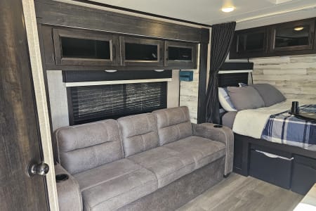 Cozy Interior: Thoughtfully designed with ample storage, overhead cabinets, and space-saving furniture. Enjoy a compact living area that feels surprisingly spacious, with large windows for scenic views.