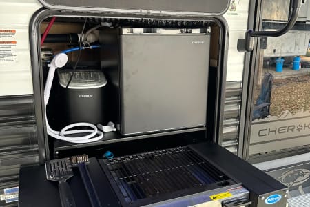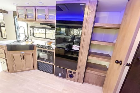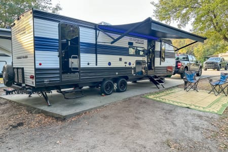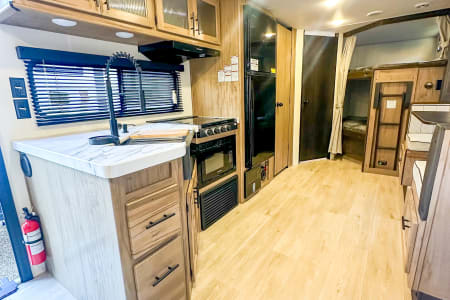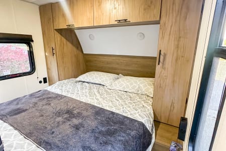 This is fully loaded with all amenities needed for a comfortable trip: unlimited wifi, outdoor kitchen, heater/AC, refrigerator, air fryer, oven, stove, bathroom with shower, private bedroom, pantry and storage space, TV and DVD player. The kitchen is stocked with all the equipment you need to cook breakfast, lunch and dinner, including a a Keurig and French press for coffee.
