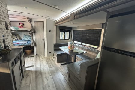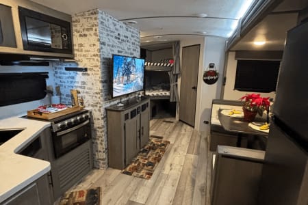 Brand new 2021 Fully featured, light weight, and easy to tow camper. Perfect for first time and seasoned campers alike. The camper is packed with many features and weighs in at less than 4,000 lb. The unique front queen bed private room whit tv . The kitchen provides a booth dinette, panoramic window, and modern appliances, while the rear bunkhouse gives you double over double bunks for additional flexibility and comfort. This RV is available for festivals and parties.