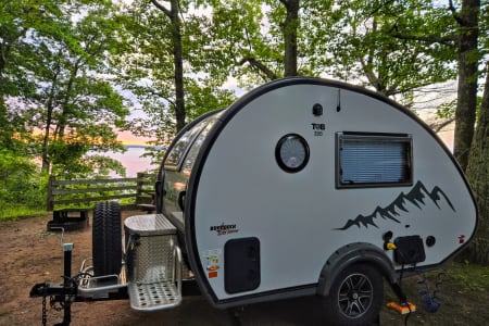 It has a fully functional wet bath which is great for a lightweight, teardrop tow behind, featuring a toilet, sink and shower.