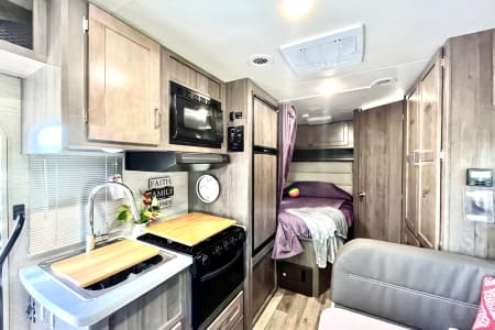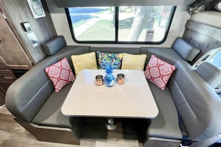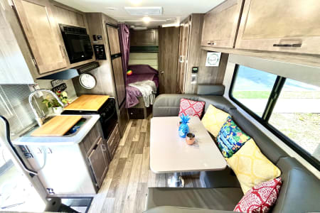 Step through the main entry door to see a U-Shaped dinette with overhead storage cabinets in front of you, flanked on the left with a large double door pantry with several drawers below. To the left of the double door pantry at the rear of the RV, is the private bathroom with shower and sink as well as a toilet with a nice cabinet for storage. In the opposite corner is a queen corner bed with a cabinet above the back end of the bed with its own TV and a privacy curtain at the front end of the bed.