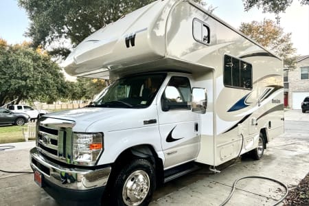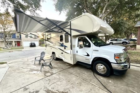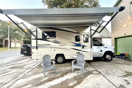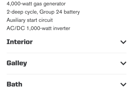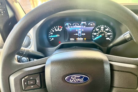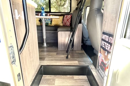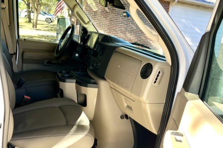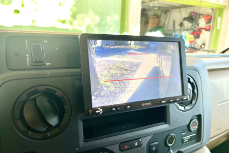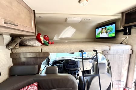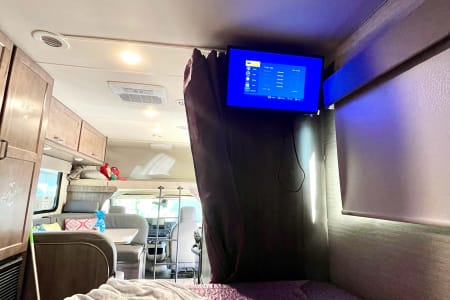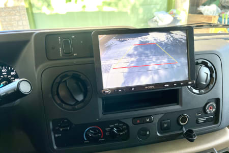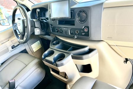 Below the overhead bed is access to the front cab that features two captains chairs, a large display screen for the bluetooth stereo and monitor for the rear/back up and side view cameras.
