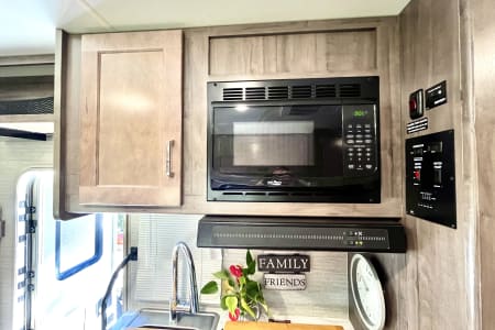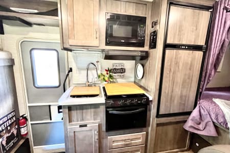 Moving back to the front of the RV on the entry side, there is a galley with a spacious refrigerator/freezer, microwave, stove, oven, and sink as well as storage cabinets above and below.
