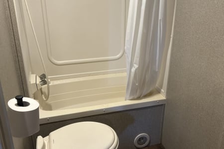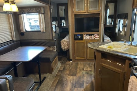 Amenities: patio shade, outdoor kitchen, outdoor shower, bathtub shower combo, large pop out dinette, TV with DVD/Blueray player, camping chairs, storage space and, 1 queen bed, 3 full size beds. Sleeps 6 comfortably rated up to 8!