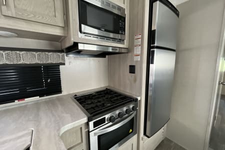 Fully equipped kitchen with a stainless steel refrigerator, microwave, 3-burner stovetop, and oven.