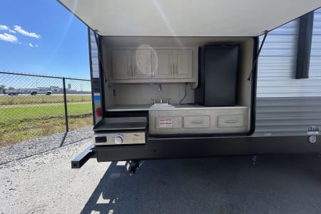 Outdoor kitchen with a mini fridge and griddle—perfect for BBQs and enjoying the fresh air.