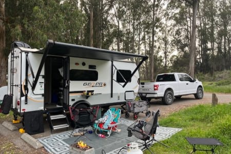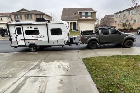 Easy towing and the trailer has solar. It will replenish energy to keep the refrigerator going indefinitely. It’s a small refrigerator so I recommend taking another 12v fridge for more storage (Or rent one from me!).
