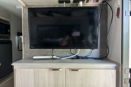 Other top-notch amenities include a power awning for added outdoor living space, roof-mounted air conditioner to keep you cool during the summer heat, and an efficient heating system for cozy nights. The outdoor speakers and LED lighting setup make for an ambient evening setting.