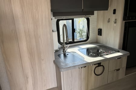The kitchen comes fully stocked with a dual-burner stove, microwave, refrigerator, and a stainless-steel sink. Whether you're cooking a full meal or just brewing coffee, everything you need is at your fingertips.