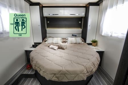 This luxurious four-berth motorhome features a rear island bed, complete with bedside tables and two wardrobes, ensuring ultimate comfort and convenience. The drop-down bed, easily stowed away during the day, maximises space for relaxation and entertainment. The popular L-shaped lounge provides seating for up to five people, making it ideal for family meals and quality time together.