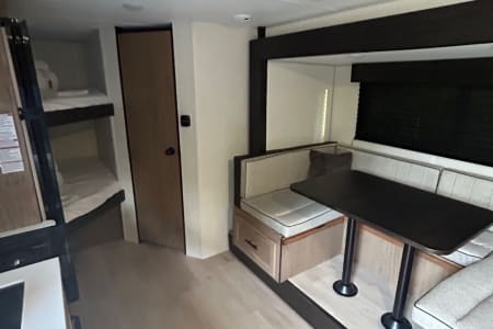 The 17JWBL is the embodiment of the family camper. The large U-shaped dinette offers great seating, full-size pull-out drawers, as well as additional sleeping for two adults. The master queen bed offers comfort, while housing huge under bed storage. A functional modern chef’s kitchen, and bathroom round out the interior of this class leading unit. The exterior under awning space provides ample entertaining space with the exclusive Pup kitchen, LED Power awning, exterior speakers, and TV bracket.