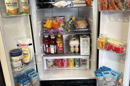 The kitchen refrigerator is quite big and has a double door for easy access to everything you need cold. The freezer drawer is a pull out at the bottom and has plenty of room for lots of popsicles. The 3-burner stove is a cooktop with enough space to feed the family when cooking. The cookware includes a stew pot, sauce pot skillet, griddle and a fry pan. We also have a coffee pot for stove top (percolated) coffee, or if you are plugged into powers there is an instant coffee maker with pods available in the cupboard above the sink. The plates, bowls, cups and drinking glasses are ready for use. As well as the silverware drawer with all your cutlery needs. The farmhouse style kitchen sink has lots of room on either side for countertop needs and will give you room to keep the dishes clean!